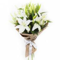 Белоснежные лилии – нежные, удивительные цветы, которые своей красотой несут первозданную чистоту и невинность. Такой чудесный букет способен послужить незабываемым подарком, наполненным любовью и позитивными эмоциями. Декоративная зелень грин-белл придает композиции изысканности, воздушности, неповторимого шарма, делает ее более завершенной и гармоничной.