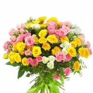 «Праздничный» букет состоит из разноцветных кустовых роз. Среди них присутствуют изысканные белые, яркие желтые и нежные розовые оттенки цветов, благодаря чему композиция выглядит невероятно красочно и привлекательно. Использование зелени писташа придает дополнительной эффектности и свежести. Такой букет отлично подойдет для выражения глубоких чувств искренности и уважения, а также поздравления близких людей с особыми праздниками.